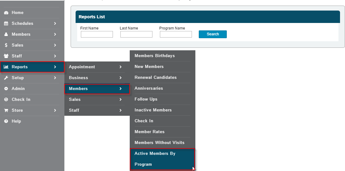 Instructions for accessing the Active Member By Program Report in Member Solutions Product Support.