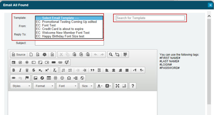 Create your template using the editor tool. The available tags to add to your email will be available on the right hand side.