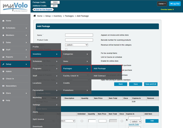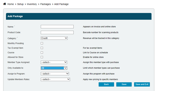 Package: A group of Items. (Individual Items an be setup under Setup>Inventory>Items.)