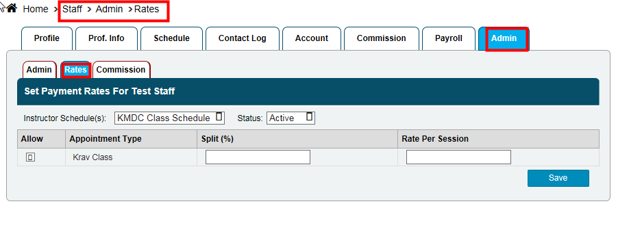 Go to Staff tab and select the staff member. Once selected, click on the Admin tab and then click on Rates: