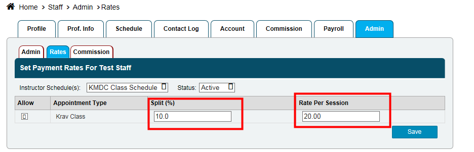 B. Rate per Session refers to the dollar amount the staff receives for each session. In the case above, this staff member gets $20.00 for every session.