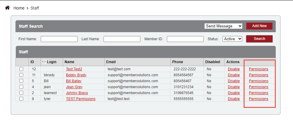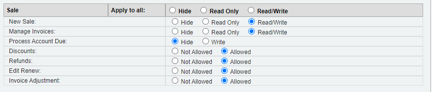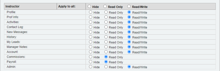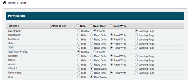 For the Top Menu, select each area that you want the staff member to have access to, and what kind of access. This will allow them to see the Menu items. In each section below the Top Menu, you can choose what type of permission is allowed for each Menu item.