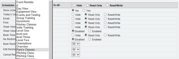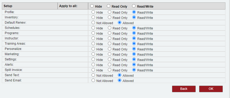 Set permissions per schedule or for all schedules. You will need to click OK at the bottom after you set permissions for each schedule so that it will save the changes. Note: Week View Only will allow the staff user to only see their appointments/classes on the schedule in the week view and no other staff member’s appointments.