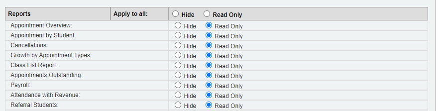 Set permissions for All Reports by clicking Read Only at the top of the column, or or set permissions for each report individually.